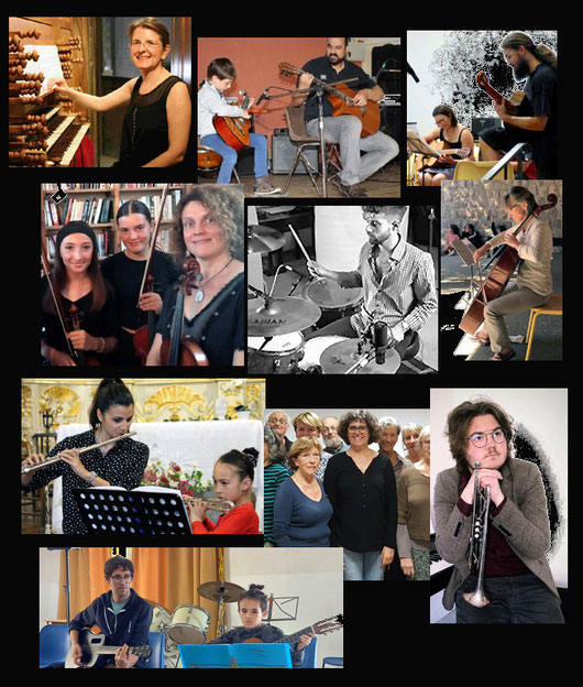 De haut en bas et de gauche à droite : - Cécile Monier, piano et orgue – Franck Camain, guitare jazz – Joey Lepan, guitare classique - Lisa Bonet-Chapuis, violon – Joël Ibarrart, batterie --Katia Alemany, violoncelle - Sabrina Klein, flûte, clarinette, saxophone – Chantal Joubert, Chant et jazz vocal - Nicolas Garcia, piano, trompette, trombone - Julien Falgayrac, guitare, éveil et initiation musicale