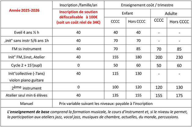 L' Ecole dispense pour les plus petits des cours d' éveil à la musique, puis, à partir de 6 ans, des cours de formation musicale et d'instruments : chant, batterie, percussions, piano, orgue, flûte traversière, saxophone, guitare classique, guitare jazz, trompette, violon et violoncelle sont ainsi proposés aux élèves de tout âge, enfants comme adultes. La pratique d'ensemble est également valorisée, à travers des ateliers divers, comme ceux d'art vocal jazz, de musique de chambre ou de musiques actuelles, que les élèves peuvent rejoindre dès que leur niveau le leur permet. Ses 10 professeurs, très investis, participent – et pour certains d'entre eux depuis la création de l'Ecole - à son rayonnement et à sa réussite.